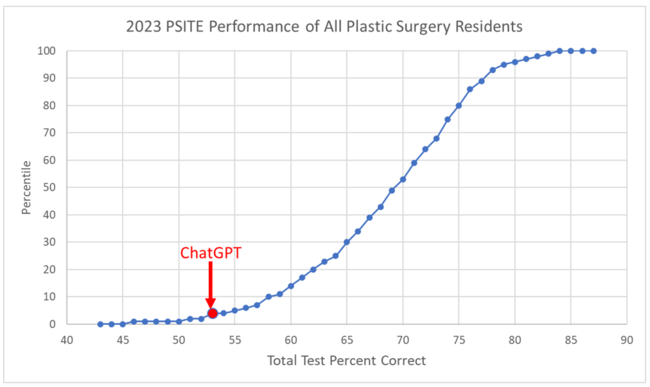 The aim of this study was to broaden the understanding and application of LLMs as they relate to the field of plastic and reconstructive surgery. ChatGPT was evaluated specifically on its performance on the Plastic Surgery In-Training Examination (PSITE). The American Society of Plastic Surgery’s (ASPS) PSITE is a test with 250 multiple choice questions administered annually to assess residents’ knowledge of plastic and reconstructive surgery principles. The areas of content included on the PSITE are comprehensive plastic surgery principles, craniomaxillofacial surgery, breast/cosmetic surgery, hand and lower extremity surgery, and core surgical principles.9 In this study, we aim to evaluate the performance of ChatGPT on the ASPS PSITE, assessing its clinical reasoning and decision-making ability as it pertains to plastic surgery competencies and comparing its performance to residents nationwide.