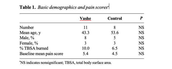 Pain data are also shown in Table 1. Mean baseline pain level was 5.4 in the Vashe Wound Therapy group and 4.5 in the control group. These pain scores were not statistically different.