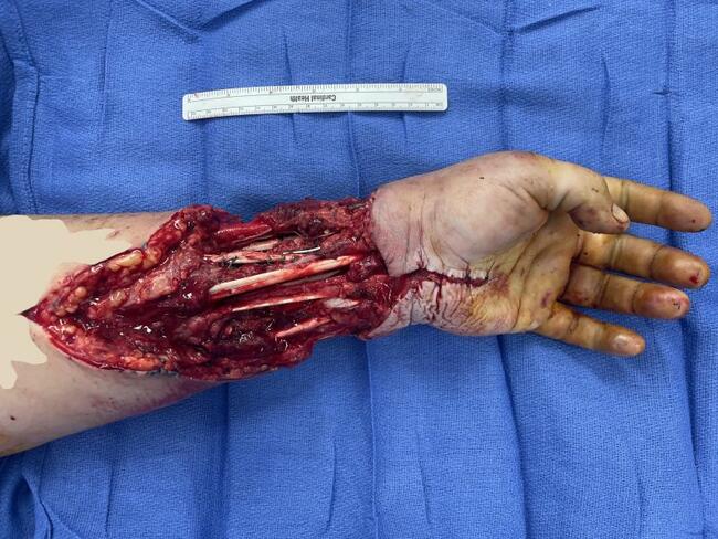 Figure 2. Full-thickness volar forearm wound after motor vehicle crash. Exposed repaired tendon can be seen prior to application of BTM (tattoo is blurred out). BTM, biodegradable temporizing matrix
