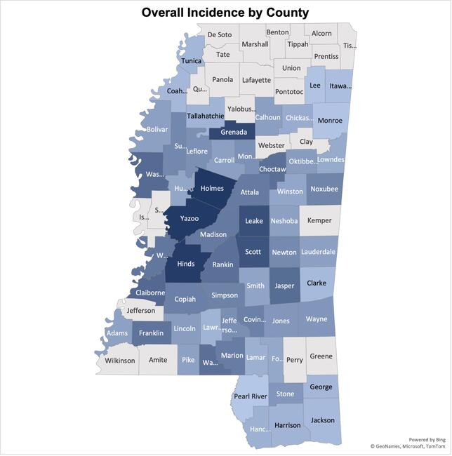 The patient's residential location as well as financial means must also be considered. Although Children's Hospital of Mississippi is centrally located in the state, it may be geographically closer for some patients in Mississippi to pursue specialized care in other states, such as USA Children's and Women's Hospital in Mobile, Alabama; Children's Hospital of New Orleans in Louisiana; or Le Bonheur Children's Medical Center in Memphis, Tennessee. Depicted in Figure 2, the proximity of nearby Le Bonheur Children's Hospital likely explains this study's lack of representation in the northernmost counties of Mississippi. Financial considerations must also be addressed, as the median per capita income in Mississippi was $42,129, markedly lower than the national average per capita income of $59,510 in 2020.12 This consideration may explain the lower reported prevalence rates in counties with lower financial means.