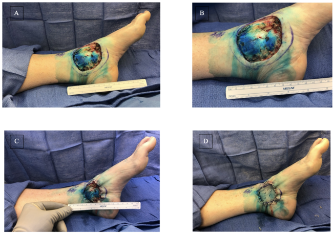 Figure 6. Patient who presented with a T4 nodular melanoma of the left ankle who underwent wide local excision. (A) A 6 x 7-cm defect of the left medial malleolus measuring an overall area of 36 cm2. (B) Close-up image of the defect. (C) Defect measuring 16 cm2 in total area after utilization of double opposing PSS. (D) Application of the split-thickness skin graft from the right thigh and secured with 3-0 chromic sutures. PSS = purse-string suture.