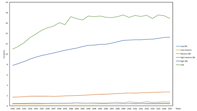 Methods: The authors assessed the records of the Global Burden of Disease Study 2017 to extract information about the incidence, mortality, and disability adjusted life years (DALY) related to melanoma during 1990–2017 in the US and other countries based on their socio-demographic index (SDI).