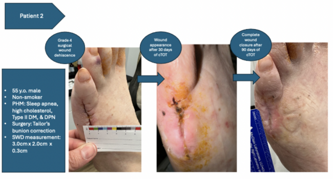 All dehisced surgical sites were treated with the standard of care including wound cleansing, debridement when indicated, and appropriate offloading. Additionally, cTOT was applied directly to the surgical site dehiscence per manufacturer guidelines and covered with a semipermeable dressing to maintain a moist wound environment. Patients were seen weekly for evaluation and assessment until complete wound closure.
