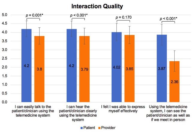 Patients responded more positively than providers to nearly all questions within the domains of usefulness, ease of use, interaction quality, and reliability. Patients consistently found telemedicine to be more useful than providers, with higher responses to “Telemedicine improves my ability to provide/access healthcare services” (3.97 ± 1.15 vs 3.49 ± 1.15; P = .001) and “Telemedicine provides for my healthcare need” (3.58 ± 1.30 vs 3.18 ± 1.15; P = .016). Patients were also more likely to state telemedicine saved time traveling to a hospital or clinic (4.20 ± 1.00 vs 2.85 ± 1.29; P < .001), which coincides with the statistical differences between patients and providers with regard to distance from home to the clinician’s place of practice (miles to primary place of practice, P = .001; minutes to primary place of practice, P < .001). Compared with providers, patients also found telemedicine systems to be easier to learn, easier to use, more reliable, and of higher quality interaction. These results signify that patients generally find telemedicine to be a valuable tool for accessing health care, and providers should be open to providing telemedicine options for their patients.