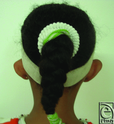 All procedures were performed under general anesthesia. V-Y advancement of the helical root was used at the upper pole of the ear to release the constricted ear and to add skin to this part. Limited postauricular incisions were made to create the antihelix and to set back the ears using the conchoscaphal (Mustarde suture) and perform the mastoid hitch. Anterior scoring of the cartilage at the zone of antihelix was done routinely in all of our cases. Conchal cartilage grafts were harvested using the anterior approach in cases with well-formed antihelix of the contralateral ear or through the posterior approach in cases where creation of the antihelix is required. Conchomastoid suture of the contralateral ear was used in all cases through the anterior or posterior approach. Mastoid hitch was then used to maintain the height and shape of the neohelix.8 No drains were used in any of our cases. And the skin was redraped and closed with 6-0 Proline sutures. Vaseline gauze and cotton dressing were used to maintain the auricular profile postoperative. A firm but comfortable head bandage was applied and removed after 1 week.