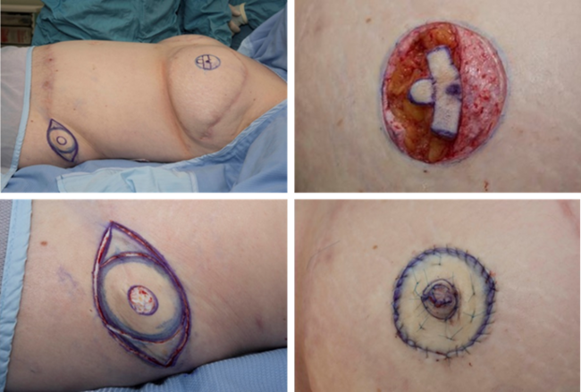 - A circular full-thickness skin graft is harvested from the lateral aspect of the abdominal scar, including and revising preexisting dog-ear deformity.