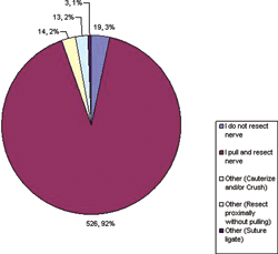 Regarding the treatment of digital nerves during digital amputations (Fig 7), 556 (97%) perform some form of digital nerve resection, while only 19 (3%) responded that they do not resect nerve. Of those that do resect, the majority pull and resect, while others try not to apply any traction while resecting. Cautery and/ or crushing the nerve along with suture ligation of the nerve were other mentioned techniques. Interestingly, the topic regarding neuroma formation created some differences, about half responding that placing the nerve away from areas of trauma was key in prevention, the other half saying that placing the nerve away from the incision was more important (Fig 8).
