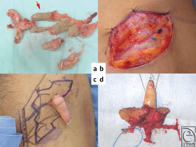 A 30-year-old man suffered a mangling injury of his right hand after it was caught in a meat grinder. All fingers were severely crushed with the exception of the little finger, which was intact distal to the proximal interphalangeal joint (Fig 1a). The hand was also crushed and ablated. We planned an ectopic implantation of the little finger to provide enough time to fully debride and optimize the hand in preparation for reimplantation of the little finger. The superficial circumflex iliac artery perforator (SCIP) and subdermal vein were first identified near the anterior superior iliac spine (Fig 1b). The diameter of the SCIP and the little finger digital artery were 0.4 mm and 0.6 mm, respectively. The digital artery of the little finger was anastomosed to the SCIP by using IVaS method.4