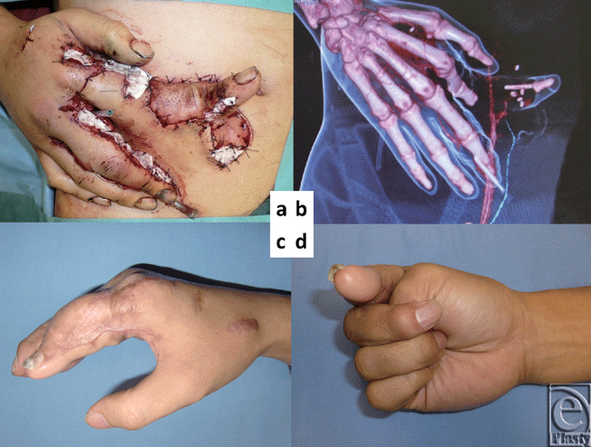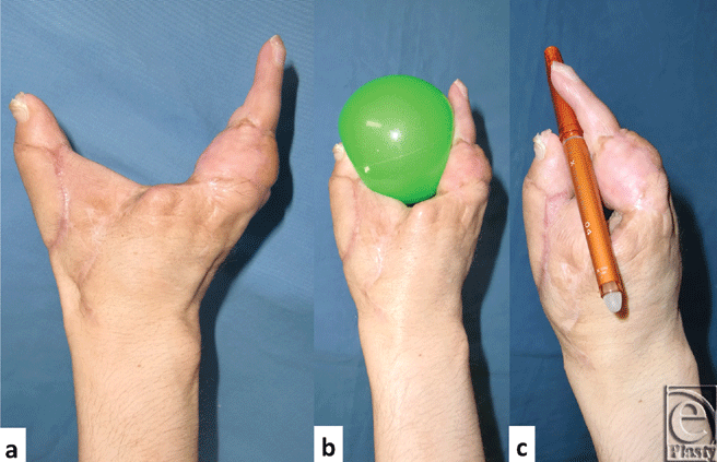 Four months after transplantation of the little finger, toe to thumb transplantation was performed.5 (Figs 3a-3c). The maximum distance between the thumb and the little finger is 10 cm.