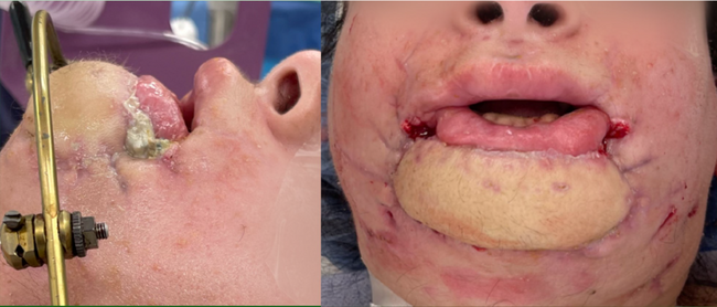 Direct explosion facial injuries create a unique clinical challenge for the reconstructive surgeon as these types of injuries can result in both large, full thickness soft tissue defects, as well as comminuted open fractures. Aesthetic restoration of the face can be challenging when the lip is involved, but greater considerations are necessary to restore oral competence to help give the patient a greater quality of life after injury. The fasciocutaneous radial forearm free flap (RFFF) has become a standard reconstructive option for large, full thickness facial traumatic wounds and postresective defects where local and regional flaps would otherwise result in significant aesthetic and functional deficits (such as microstomia).1-2 In recent years, its usage in composite tendinofasciocutaneous flaps has created avenues for improved oral competence after oral reconstruction.3-6