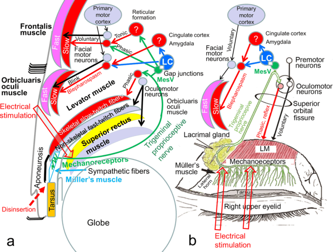 | Keywords: orbicularis oculi reflex, trigeminofacial reflex, slow-twitch fibers, mechanoreceptors in Müller's muscle, blepharospasm |