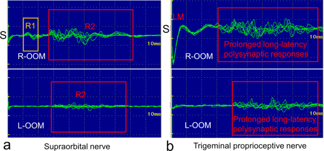 | Figure 4. Representative orbicularis oculi reflexes induced by electrical stimulation of the supraorbital nerve (a) and the trigeminal proprioceptive nerve innervating the mechanoreceptors in Müller's muscle (b) in a 61-year-old woman, as shown in Figure 3. S indicates the side of electrical stimulation; R-OOM, right orbicularis oculi muscle; L-OOM, left orbicularis oculi muscle; LM, a volume-conducted response from the ipsilateral levator muscle to orbicularis oculi muscle. |
