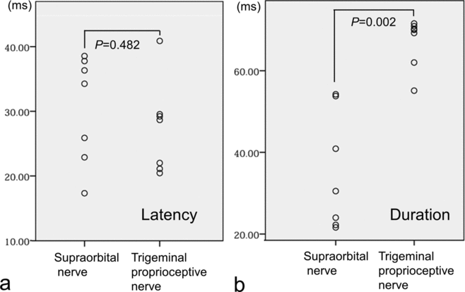 Stimulation of the supraorbital nerve induced an R1 response in the ipsilateral orbicularis oculi muscle and R2 responses (mean latency: 30.4 milliseconds; mean duration: 35.3 milliseconds) in the bilateral orbicularis oculi muscles with ipsilateral dominance (Fig 4a). Stimulation of the trigeminal proprioceptive nerve on the proximal Müller's muscle did not induce a phasic oligosynaptic response but rather induced a short-latency phasic response as a volume-conducted response from the ipsilateral levator muscle to the orbicularis oculi muscle22 as well as prolonged long-latency polysynaptic responses (mean latency: 27.4 milliseconds; mean duration: 67.0 milliseconds) in the bilateral orbicularis oculi muscles with ipsilateral dominance (Fig 4b). The mean latency of prolonged long-latency polysynaptic responses (27.4 milliseconds) induced by stimulation of the trigeminal proprioceptive nerve did not significantly differ from that of R2 responses (30.4 milliseconds) induced by stimulation of the supraorbital nerve (P = 0.482) (Fig 5a). In contrast, the mean duration of prolonged long-latency polysynaptic responses (67.0 milliseconds) induced by stimulation of the trigeminal proprioceptive nerve was significantly longer than that of R2 responses (35.3 milliseconds) induced by stimulation of the supraorbital nerve (P = 0.002) (Fig 5b).