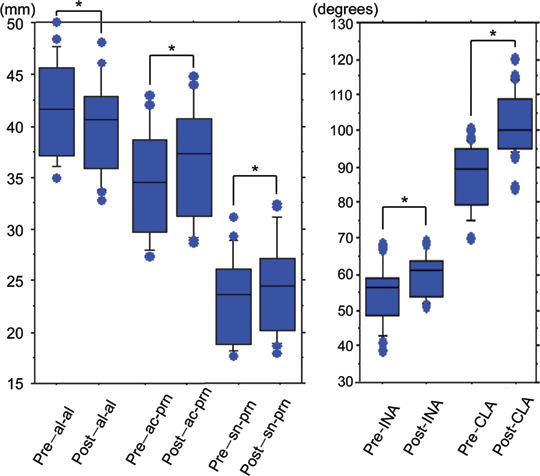 The nasal tip projection was advanced using the procedure described above (Figs 1, 2, and 3). The mean pre-injection scores for al-al, ac-prn, sn-prn, INA, and CLA were 4.162 ± 0.452, 3.449 ± 0.502, 2.315 ± 0.404, 54.62 ± 8.228, and 87.75 ± 8.938, respectively. The mean post-injection scores were 3.972 ± 0.465, 3.655 ± 0.531, 2.427 ± 0.429, 59.7 ± 5.928, and 102.4 ± 9.005, respectively (Fig 4). Augmentation of the retropositioned ANS significantly decreased nasal width (al-al), but increased alar length (ac-prn), nasal tip protrusion (sn-prn), inclination of the nostril axis from the horizontal (INA), and columellolabial angle (CLA) (P < .0001).