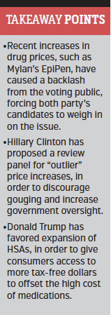 After looking at both Mrs Clinton’s drug plan—including provisions added recently—and the House Republicans’ proposals, Mr Smith teased out two specific items that he believes the public would latch on to. Specifically, if Mrs Clinton prevails, he thinks that her proposal to deal with drug price increases that are categorized as “outliers” could gain traction fast. On the Republican side, after a Trump win, expanding health savings accounts (HSAs) would likely get attention.