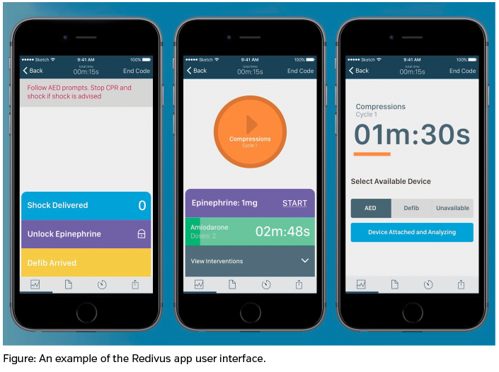 The competitive advantage of the Redivus Health solution is its simplicity and intuitive user experience. National clinical guidelines for treating a critical medical situation like cardiac arrest amount to a complex 30+ step algorithm or multiple pages of PDFs. In a medical crisis, there’s no time to waste. The Redivus platform is quickly accessible on a mobile device. We have taken rather complex clinical algorithms and intelligently automated them so that providers can get through a cardiac arrest, stroke, sepsis, or heart attack event with 100% compliance and documentation accuracy. A great comparison is to GPS apps—what you would expect to see if you launched a cardiac arrest scenario on the Redivus app is similar to the turn-by-turn guidance that a navigational application gives a user to get from point A to point B.