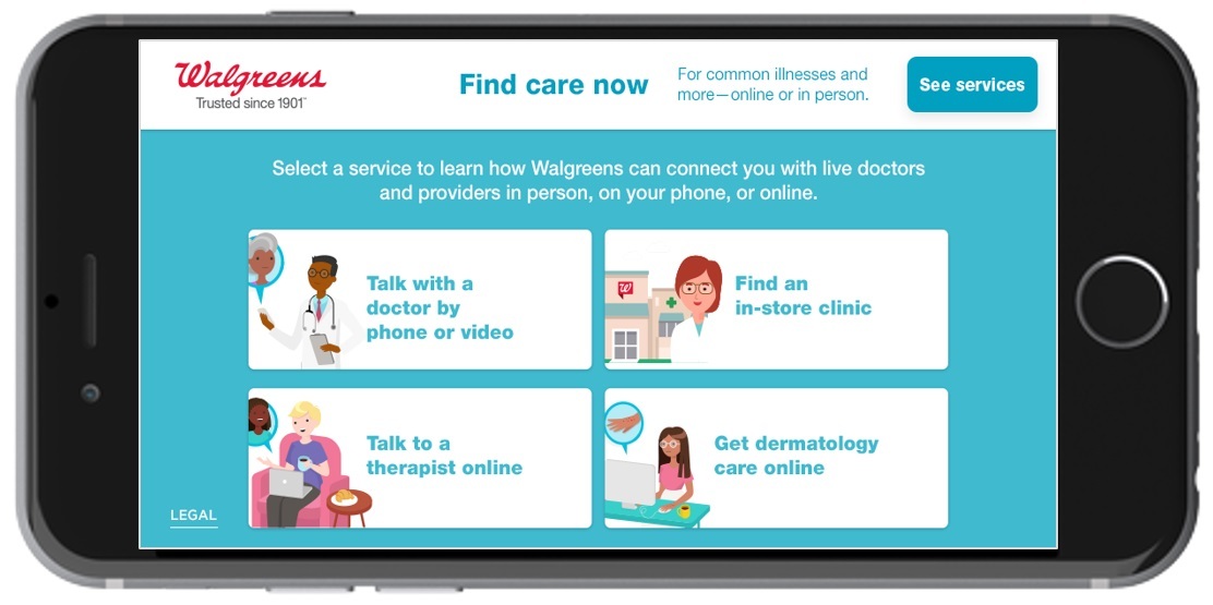 Find Care Now is a digital platform and marketplace that can be accessed via the Health Services section of the Walgreens mobile app and on the Walgreens website. Navigation, selection, and booking is easy and convenient, via geolocation, with a prominent, upfront display of pricing and condition filtering.
