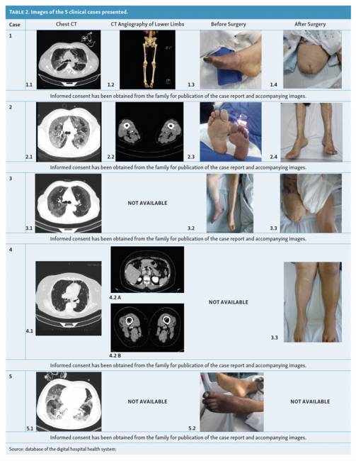 Five clinical cases were collected from the beginning of the contingency due to the current COVID 19 pandemic in March, 2020 through September, 2020 at the IESS Quito Sur Hospital in Ecuador, which is cataloged as a sentinel hospital for the care of infected patients with COVID-19 (Tables 1 and 2). In order to be included, patients had to present a respiratory condition secondary to the SARS-CoV-2 virus confirmed by polymerase chain reaction, associated with acute limb ischemia after having acquired said infection (severity was defined according to the Rutherford classification for acute ischemia), with prior authorization from the institution. A bioethics letter guaranteed the ethical principles of the study, and clinical records were analyzed. All patients were managed by the authors of this article.