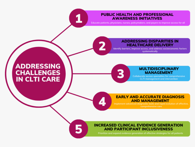 In conclusion, while considerable progress has been made in recognizing and addressing CLTI, significant challenges persist, particularly regarding disparities in access to timely and effective treatment. The multifaceted barriers hindering equitable CLTI care, such as socioeconomic factors and limited health care access, necessitate targeted interventions and public health measures to improve outcomes for all affected individuals. Efforts to enhance early recognition, team-based care, and tailored management strategies are paramount, with initiatives such as the ELEGANCE trial serving as crucial endeavors in bridging gaps in knowledge and practice. Despite challenges in accurate diagnosis, ongoing research and the adoption of advanced diagnostic modalities offer promising avenues to improve patient outcomes. Additionally, proactive population health management strategies, focused on preventive care, risk management, and patient education, are vital in addressing disparities and improving overall vascular health. By collectively addressing these challenges and fostering collaborative efforts, health care systems can strive toward achieving more equitable outcomes in CLTI management and ultimately enhance the health and well-being of affected populations.
