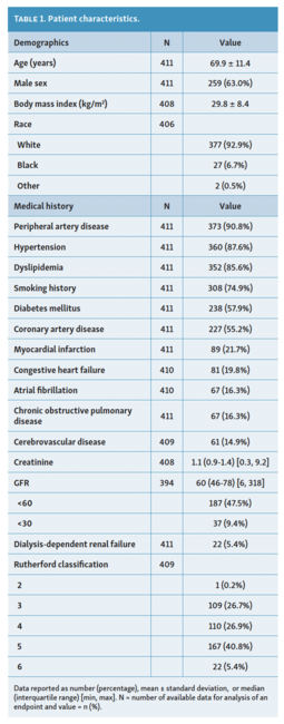 Patient characteristics. Mean age of patients was 70 years with 63% male. The patients were predominantly white (93%). As shown in Table 1, the most common comorbidities were hypertension (88%), dyslipidemia (86%), diabetes (58%), coronary artery disease (55%), and renal disease (57%). The majority of patients (73%) had CLI (RC 4-5).