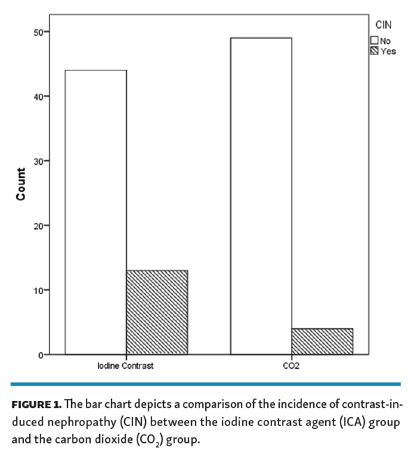 Study limitations. The results of the current investigation should be interpreted in light of the following limitations. First, the complete difference both in equipment for CO2 and ICA injection and in imaging protocols concerning digital subtraction angiography precluded a blinded design. Second, despite our random assignment of the study population to CO2 or ICA groups, the baseline creatinine level was higher in the CO2 group. However, the final rate of CIN was significantly lower in the mentioned group, and importantly, baseline creatinine was not a significant predictor of the risk of CIN in our multivariate analysis. Third, we did not compare x-ray exposure time between our 2 study groups. Finally, our results would have been bolstered had we evaluated the long-term impact of CIN on patient survival and the related economic burden.
