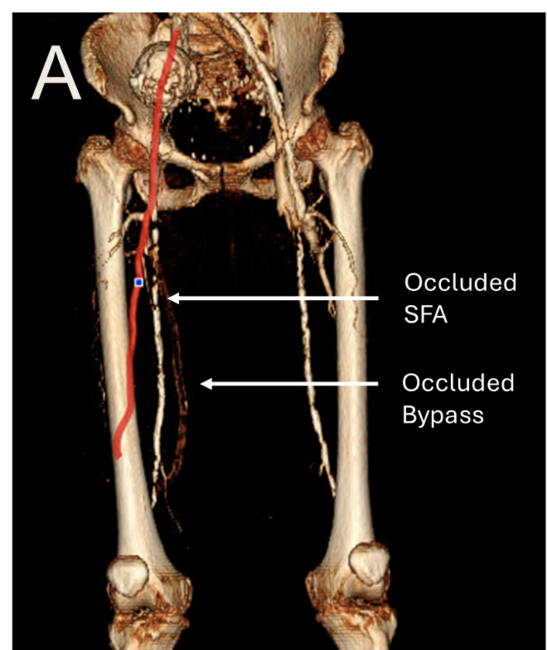 Approximately 1.5 years prior to consultation, the patient’s ankle-brachial indices were measured at 0.46 on the right and 0.24 on the left. Given her significant comorbidities and frailty, the patient was deemed unsuitable for further revascularization at that time by another department. However, her persistent and severe ischemic pain continued to be a major concern for the patient and her family. A CT angiogram (CTA) was obtained at our institution through another department, with the aim of identifying potential revascularization targets that could alleviate her symptoms. The CTA revealed severe diffuse bilateral vascular disease, including 60% to 70% stenosis of the distal aorta, severe stenosis of the right common femoral artery, occlusion of a right profunda-to-popliteal bypass graft and occluded native right superficial femoral artery, an occluded or severely stenotic right popliteal artery, and 2-vessel runoff to the right foot via the posterior tibial and peroneal arteries (Figures 1 and 2). On the left, there was multifocal mild-to-moderate disease in the common and proximal external iliac arteries, a patent external iliac stent, long-segment occlusion of the left superficial femoral artery, and 2-vessel runoff to the left foot via the posterior tibial and peroneal arteries (Figure 3).
