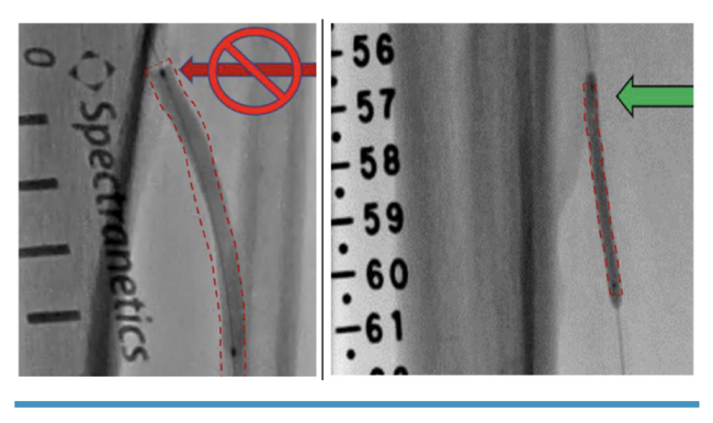 In order to achieve successful deployment of the MicroStent, device deployment should be slow and steady to avoid elongation and stacking, which can reduce the designed engineering properties of the MicroStent. For lesions requiring multiple MicroStents, a ~1 cm overlap is recommended. Deployment should always be distal to proximal (anatomically) such that the proximal stent (upstream) lays within the distal stent (downstream). After completion of MicroStent deployment, postdilation is strongly recommended. The labeled diameter of the balloon used should not exceed the diameter of the MicroStent. The operator should ensure that distal and proximal ends of the stent are adequately dilated. The balloon should extend just outside of the stent end to ensure full dilation (Figure 4).