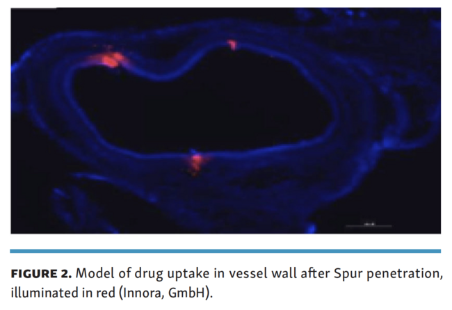After deployment, the temporary stent is further dilated with a balloon, creating small channels in the vessel wall. These channels may alter the vessel wall to allow for greater uptake of antiproliferative drug, into the media, delivered via DCB (Figure 2). Stent scaffolding adds temporary structural support during balloon expansion, which is intended to reduce vessel recoil. The combination of these effects is intended to address 2 primary barriers to vessel patency in the infrapopliteal artery, ie, the immediate effect of vessel recoil and the longer-term effects of poor penetration of antiproliferative drug.