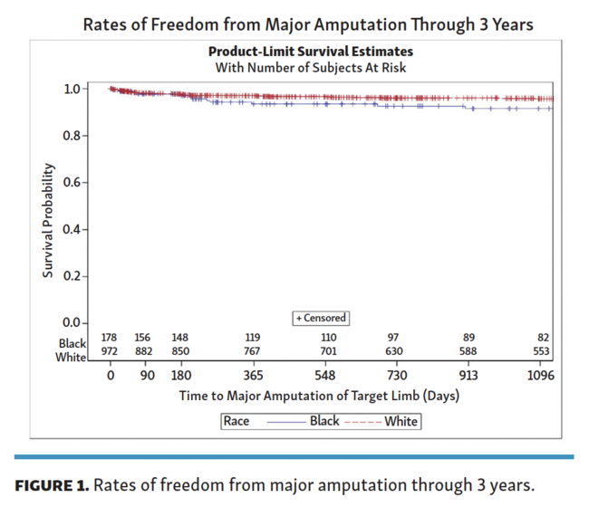 Nonetheless, the hypothesis of biological characteristics over Social Determinants of Health (SDoH) has been heavily questioned.19,46-48 In our study, which includes real-world data, a higher risk for major amputation or death was observed among Black vs White patients at 1-year and 3-year follow-up, likely driven by a higher amputation risk for Black patients. However, isolated infrapopliteal disease and renal disease requiring hemodialysis were more frequent among Black patients, placing them at higher risk for major amputation. Additionally, the 6-month and 12-month wound-healing rates were similar between the 2 groups, making the hypothesis of racial differences in biological characteristics very unlikely. Thus, the association of race with major amputation demonstrated by the current study was likely attributable to population-related characteristics, SDoH, and/or physician decision making rather than by underlying biological mechanisms.