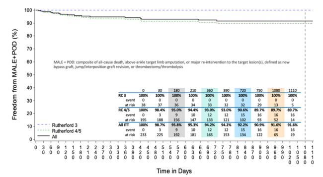 At 36 months, freedom from MALE + POD was 91.6% in the total patient population (Figure 2A). In patients with IC (Rutherford category 3), 36-month freedom from MALE + POD was 100.0%. In patients with CLTI (Rutherford category 4/5), freedom from MALE + POD was 89.7% at 36 months.