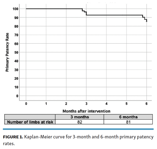 Outcome. Patients were followed up for a mean duration of 168 ± 89.3 days. On a patient-level analysis, 1/84 (1.2%) had contrast-induced renal injury post operation. All-cause mortality rate was 7/84 patients (8.3%) at 6 months and consisted of hospital-acquired pneumonia in 1/7 (14.3%), osteomyelitis in 1/7 (14.3%), ischemic bowel in 1/7 (14.3%), sepsis in 1/7 (14.3%), and cardiovascular related in 3/7 (42.9%). Twenty-one of the 84 patients (25.0%) had independent ambulatory status at baseline. At 3 months and 6 months, 35/79 patients (44.3%) and 29/67 patients (43.3%) had independent ambulatory status, respectively. On a limb-based analysis, freedom from TLR occurred in 78/82 (95.1%) and 73/81 (90.1%) at 3 months and 6 months, respectively. Three-month and 6-month primary patency rates were 76/82 (92.7%) and 69/81 (85.2%), respectively. Figure 1 shows the Kaplan-Meier survival curve. Complete wound healing rates at 3 months and 6 months were 19/74 (25.7%) and 28/50 (56.0%), respectively. Six-month AFS rate was 68/78 (87.2%). Mean Rutherford scores decreased by a mean of 1.43 ± 1.92 (P<.001) and 2.73 ± 2.41 (P<.001) at 3 months and 6 months post procedure, respectively. Fifty-three of 84 patients (63.1%) had at least 1 Rutherford class improvement at 6 months. On a lesion-level analysis, 6-month primary patency rates of above-the-knee (ATK) lesions treated with and without Ranger balloons were 64/76 (84.2%) and 3/8 (37.5%), respectively (P<.01). Six-month primary patency rates of below-the-knee (BTK) lesions treated with and without Ranger balloons were 89/94 (94.7%) and 34/41 (82.9%), respectively (P=.03). Table 3 summarizes the postprocedural and follow-up data.