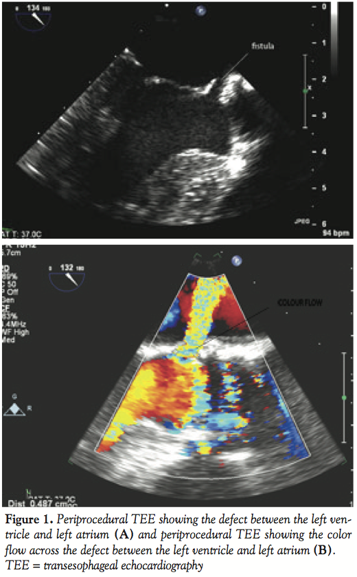 Conclusion. In patients with AVR who develop a jet in the LA, one should consider the possibility of an LV to LA fistula as an alternative to mitral regurgitation, and a TEE is recommended. Percutaneous closure is feasible and we believe this is the first such case in the literature. It could be considered as the preferred approach even in less risky circumstances.