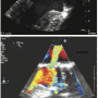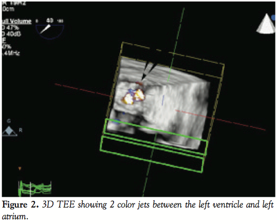 Periprocedural TEE showed the defect between the LV and the LA measured 7 mm (Figures 1A and B) and 2 color flow jets were visualized suggesting 2 leaks adjacent to each other. The defect was also clearly visualized on 3D TEE (Figure 2). TEE guidance is very useful in this situation to assess the anatomy clearly and guide device closure percutaneously.