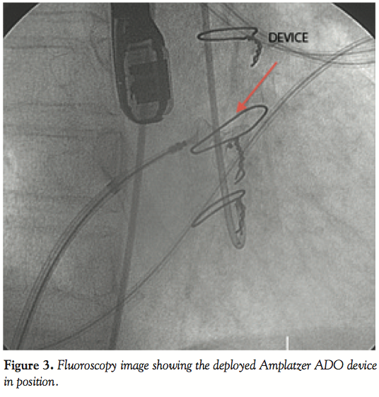 The choice of the ADO has to do with the small rim. Because the LV pressure is much higher than the LA, we did not need a rim on the LA side as this could have interfered with the MV leaflets and was not necessary. The defect appeared round on 3D TEE and so the AVPIII, which are oblong, would not have been suitable. For the same reasons, in this particular location, using an ASD, VSD, or ADOII device would not have been ideal. It is also important to distinguish this LV-LA fistula from a paravalvular leak as in the latter there is a valve rim but in our case we had no rim around the mitral valve. A small rim would have also helped protect the aortic valve.