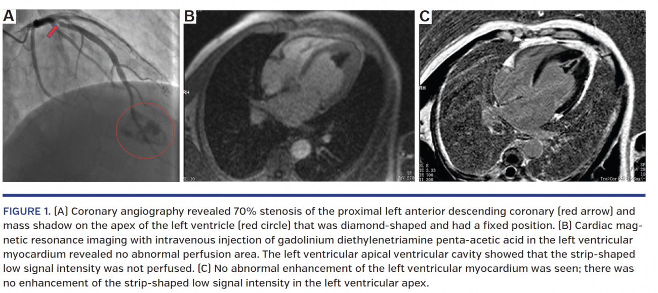 A 67-year-old man was admitted to our hospital due to chest tightness induced by activity that had started about 2 months earlier. Electrocardiography revealed left ventricular hypertrophy with negative T-waves in leads I, II, aVL, aVF, and V2 to V6. His troponin and N-terminal pro-brain natriuretic peptide levels were normal. Coronary angiography showed 70% stenosis of the proximal left anterior descending coronary artery. However, there was a mass shadow on the apex of the left ventricle, the position of which was fixed; there was no abnormal swing in the contraction of the heart chamber (Figure 1 and Video 1). Possible underlying etiologies included pericarditis, myocarditis, and intracardiac tumor in the left ventricle or metastatic adenocarcinoma; therefore, we performed cardiac magnetic resonance imaging, which resulted in a diagnosis of ventricular apical hypertrophic cardiomyopathy with intramyocardial calcification (Figure 1). Intramyocardial calcification can exist only in the heart chamber, with no calcification in other parts.