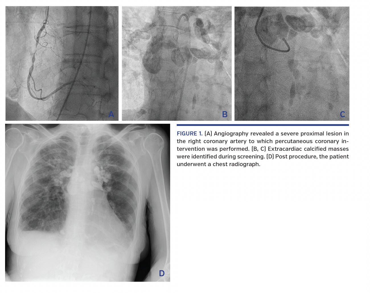 Angiography revealed a severe proximal lesion in the right coronary artery to which percutaneous coronary intervention was performed (Figure 1A). The patient experienced intermittent complete heart block during the procedure; she remained hemodynamically stable and pacing was not required. Extracardiac calcified masses were identified during screening (Figures 1B and 1C; Video 1).
