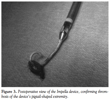 One specific issue is the irrigation of the device by continuous heparin and dextrose infusion to prevent blood from reaching the engine. Anticoagulation is needed to prevent clotting. To our knowledge, we are presenting the first documented case of massive thrombosis of an Impella device. The macroscopic aspect of the thrombus after device explantation (Figure 3) suggests that a pre-existing and unspotted intraventricular thrombus must have been sucked up inside the device, ie, a long clot trapped inside the pigtail tip of the inflow segment. The subtherapeutic anticoagulation levels obtained prior to this event and the large anterior and apical akinesia predisposing to thrombus formation further support this hypothesis.