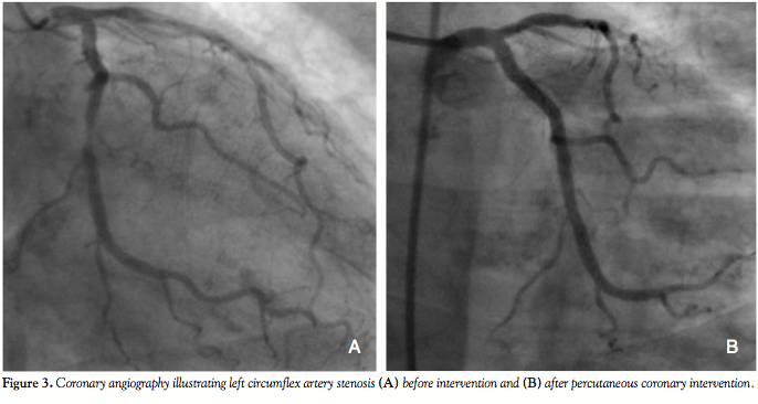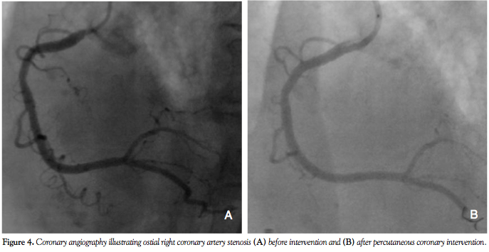 an 80% left circumflex artery (LCX) stenosis and an ostial 80% right coronary artery (RCA) stenosis (Figures 3A and 4A). Aortic root angiography revealed trivial aortic regurgitation and an aortic annular diameter of 24 mm, and peripheral angiography showed adequately-sized common femoral and iliac arteries with no significant stenosis or kinking. Successful percutaneous coronary intervention with implantation of two zotarolimus-eluting stents was achieved in