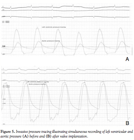 (NuMED, Hopkinton, New York) under rapid pacing, followed by implantation of a 29 mm Medtronic CoreValve prosthesis (Medtronic Parkway, Minneapolis, Minnesota). Final rest gradient across the aortic valve was 5 mmHg with only mild aortic regurgitation (Figure 5B). Vascular closure was achieved percutaneously with the Perclose vascular closure device (Abbott Vascular). The whole procedure duration was 48 minutes with a total of 250 ml of contrast material used.