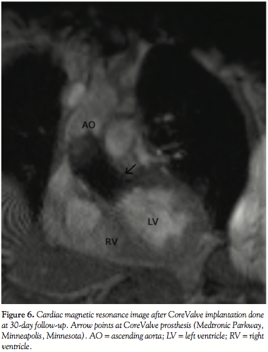 prosthetic aortic valve with an estimated valve area of 2.1 cm2 and a mean gradient of 12 mmHg. Cardiac magnetic resonance was performed for evaluating the CoreValve function and revealed mild aortic regurgitation with a retrograde volume of 5.96 ml (Figure 6). At 6 months, the patient continued to be symptom-free and the prosthetic aortic valve was functioning appropriately.