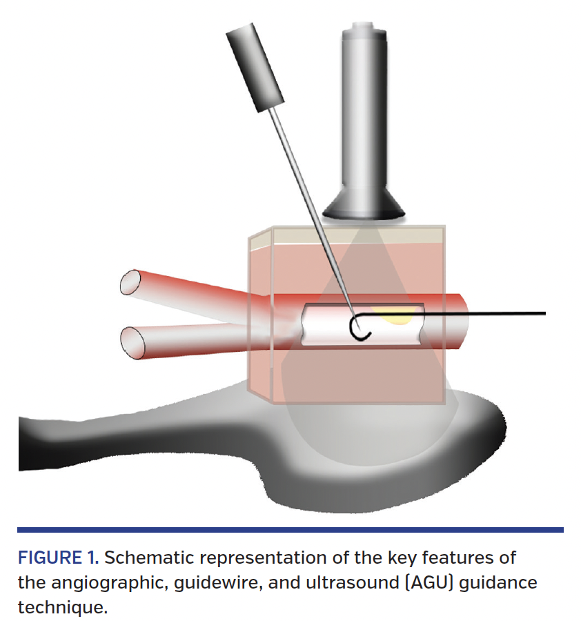 Angiographic, guidewire, and ultrasound (AGU) guidance. We integrated several different techniques to create the AGU guidance technique (see Figure 1 for schematic representation), which is specifically designed with the aim of facilitating the achievement of a precise femoral entry in patients with complex anatomy undergoing procedures requiring large femoral sheaths with simultaneous use of other arterial accesses. The AGU guidance technique consists of the following steps (Figure 2):