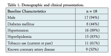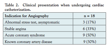 great vessels (aorta and pulmonary artery). Of the 5205 angiograms performed, there were no other anomalous coronary arteries besides the ALCx that took a retro-aortic course. The indication for angiography was positive functional study in 3/18 (17%) (with only 1 in the circumflex territory), stable angina in 6/18 (33%), or acute coronary syndrome (ACS) in 9/18 (50%) (Table 2). The circumflex was never the infarct-related artery in the ACS cases.