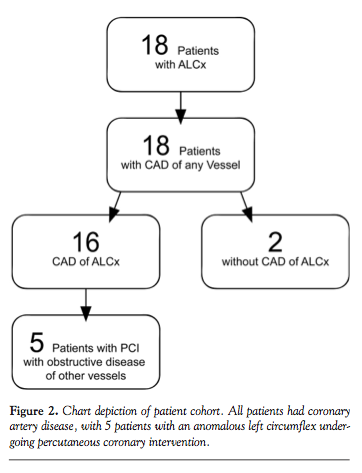Abstract: Objective. To determine the incidence of angiographically evident coronary artery disease (CAD) of the anomalous left circumflex artery (ALCx). Background. Due to the acute angulation of its origin from the aorta and its retroaortic course, some have proposed an increase in CAD in these vessels. Methods. We performed a retrospective cohort study of all patients (n = 5205) presenting for left heart catheterization at the St Louis Veterans Affairs hospital from 2006-2012. Quantitative coronary angiography (QCA) was performed by two independent operators for all cases identified as having ALCx (n = 18). Results. We identified 18 patients (0.346%) with this anomaly. Sixteen of 18 cases (89%) had atherosclerosis involving the ALCx. QCA performed on the ALCx for all 18 patients resulted in a mean stenosis of 61% (range, 10%-100%). Seven out of 18 patients (39%) had obstructive CAD of the ALCx with the majority (n = 6; 86%) also having concomitant obstructive disease in the left anterior descending (LAD) or right coronary artery (RCA). In the 5 cases where the ALCx underwent intervention, the mean diameter stent was 2.25 mm, with a mean length of 15 mm, indicating that these vessels were small in caliber with focal disease. At a mean follow-up of 18 months for all patients, there was 1 non-cardiac death in the non-intervened group, with the 17 remaining patients (94.7%) free of major adverse cardiovascular events (target lesion revascularization, target vessel revascularization, or death). Conclusions. This study suggests that indeed this most common anomaly appears to be benign in that its unique origin and/or retroaortic course do not increase the occurrence of atherosclerosis relative to the LAD and RCA.