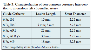 This study was approved by the St Louis VA Healthcare Internal Review Board (IRB) under the regulations and guidelines set forth by the reviewing body. All coronary angiograms (n = 5205) from January 2006 to January 2012 performed at the St Louis Veterans Affairs Medical Center were reviewed for the presence of an anomalous circumflex artery. Comprehensive chart review to assess the clinical characteristics and outcomes of patients who were identified as having an ALCx was performed using the electronic medical records. The angiograms of these patients were analyzed and quantitative coronary angiography (QCA) of the ALCx and any stenosis using validated software was performed by two independent operators. The course of the ALCx was specifically reviewed per the classification of Page et al2 type (I-III). For those patients who underwent PCI, procedural details were also examined. Continuous variables were analyzed and reported as mean, median, range, and standard deviation. Student’s t-test for continuous variables was used in comparison of data. A P-value of <.05 was considered significant.