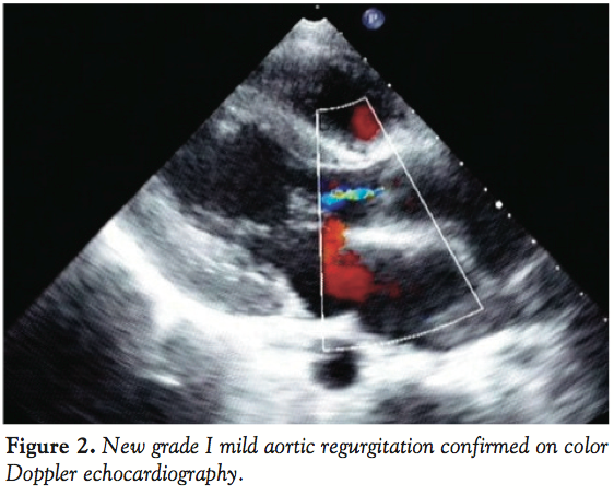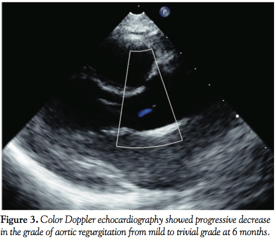 Functional AR could occur in structurally normal aortic valves following closure of high flow left to right shunts at aortic level. This can be explained by an acute increase in the systemic vascular resistance as a result of disconnection of the low resistance pulmonary circuit from the systemic circulation3 or due to altered geometry of the aortic root following sudden elimination of a large shunt and increased compliance.1