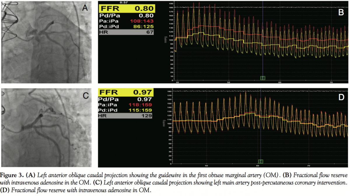 LIMA graft to be patent (Figure 2A). The ostial stenosis in the LMCA had progressed to 90% (Figure 2B) with no other new findings (Figure 2C). Because of worsening symptoms, increase in the LMCA stenosis and pressure dampening with catheter, fractional flow reserve (FFR) was performed to determine the physiologic significance of this lesion. With the pressure transducer in the obtuse marginal (OM) artery (Figure 3A), FFR using intravenous adenosine was 0.80 (Figure 3B). A bare-metal stent was implanted in the LMCA (Figure 3C). Postintervention FFR was 0.97 (Figure 3D). At 4-week follow-up, the patient was asymptomatic. The patient presented with atypical chest pain 3 months after PCI. Angiography showed a patent LMCA stent (Figure 4A) with significant atresia of the entire length of the LIMA graft (Figure 4B). He was maintained on aggressive medical management. Nuclear stress test done 6 months later showed no evidence of ischemia (Figure 5).