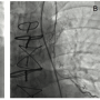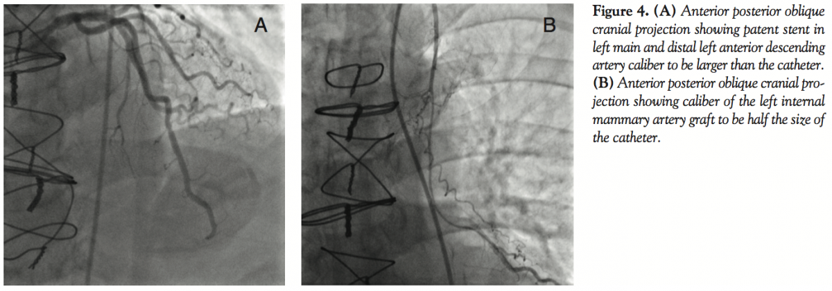 Case Report. A 65-year-old male with hypertension and hyperlipidemia was admitted for worsening angina. Angiography showed an isolated 80% ostial left main stenosis (Figures 1A and 1B). He underwent coronary artery bypass graft surgery (CABG) with a sequential LIMA to the distal LAD and the first diagonal artery without SVG grafting to the circumflex. The patient was asymptomatic for 3 months, after which he developed progressive, exertional angina despite optimal medical management. Six months after CABG, angiography showed the