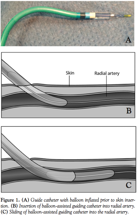 Abstract: Background. The sheathless approach to transradial percutaneous coronary intervention (PCI) has recently gained popularity among interventionalists. However, technical problems and lack of approved equipment in the United States has limited its applicability. We describe a new approach, balloon-assisted sheathless transradial intervention (BASTI) that can ease the use of 5 Fr sheathless guiding catheters and decrease complication rates. Methods. Twenty-seven consecutive patients undergoing staged elective PCI were enrolled. Radial artery access was obtained using the BASTI method — inflation of a compliant coronary balloon at the tip of the guiding catheter was used to ease the transition of the catheter into the skin. The guidewire and coronary balloon were reused during the PCI. Each of the patients had clinical postprocedure follow-up at radial compression device release, and at 1 day, 7 days, and 30 days. Major adverse cardiac events and access-site complications, including radial artery occlusion (RAO), were documented. Results. In this consecutive series, we successfully attempted (27/27) BASTIs. There were no difficulties in obtaining radial artery access with the 5 Fr sheathless guiding catheter. Two patients had balloon rupture during initial radial artery access, but were successfully re-attempted with a higher balloon inflation pressure. All patients then underwent successful coronary intervention. There were no adverse events or procedure-related complications at any time period during follow-up. Conclusion. BASTI is a feasible alternative to conventional techniques and may reduce vascular access-site complications and patient morbidity in a cost-effective manner.