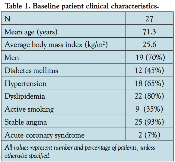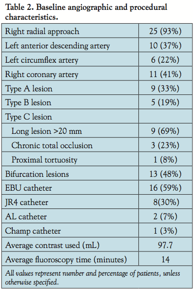 were encountered in 48% of cases and included lesions containing long disease segments ≥20 mm, chronic total occlusions, or tortuosity of the proximal vessel segment. The average amount of contrast used was 97.7 mL while the average fluoroscopy time was 14 minutes. There was no difficulty in stent deployment and no cases required stent withdrawal. Clinical outcomes including RAO are shown in Table 3. There were no procedure-related complications, such as guide catheter