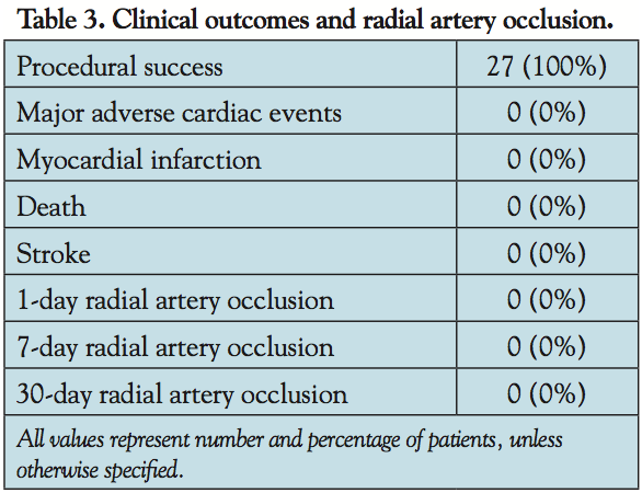 dissection, to report. No patient experienced radial artery spasm or complained of access-site pain during catheter insertion or withdrawal. In 25 out of 27 patients, radial artery access was obtained with one attempt. Two patients had the balloon rupture during initial attempt at skin insertion. After a second attempt was performed using a higher pressure of balloon inflation and ensuring adequate skin dilation by using a 4 Fr sheath dilator (outside diameter, 0.035″), radial artery access was successfully obtained in these patients as well. All patients underwent successful PCI. There were no adverse events or procedure-related complications at any time period during follow-up. Radial artery patency was confirmed in all patients at each time point.